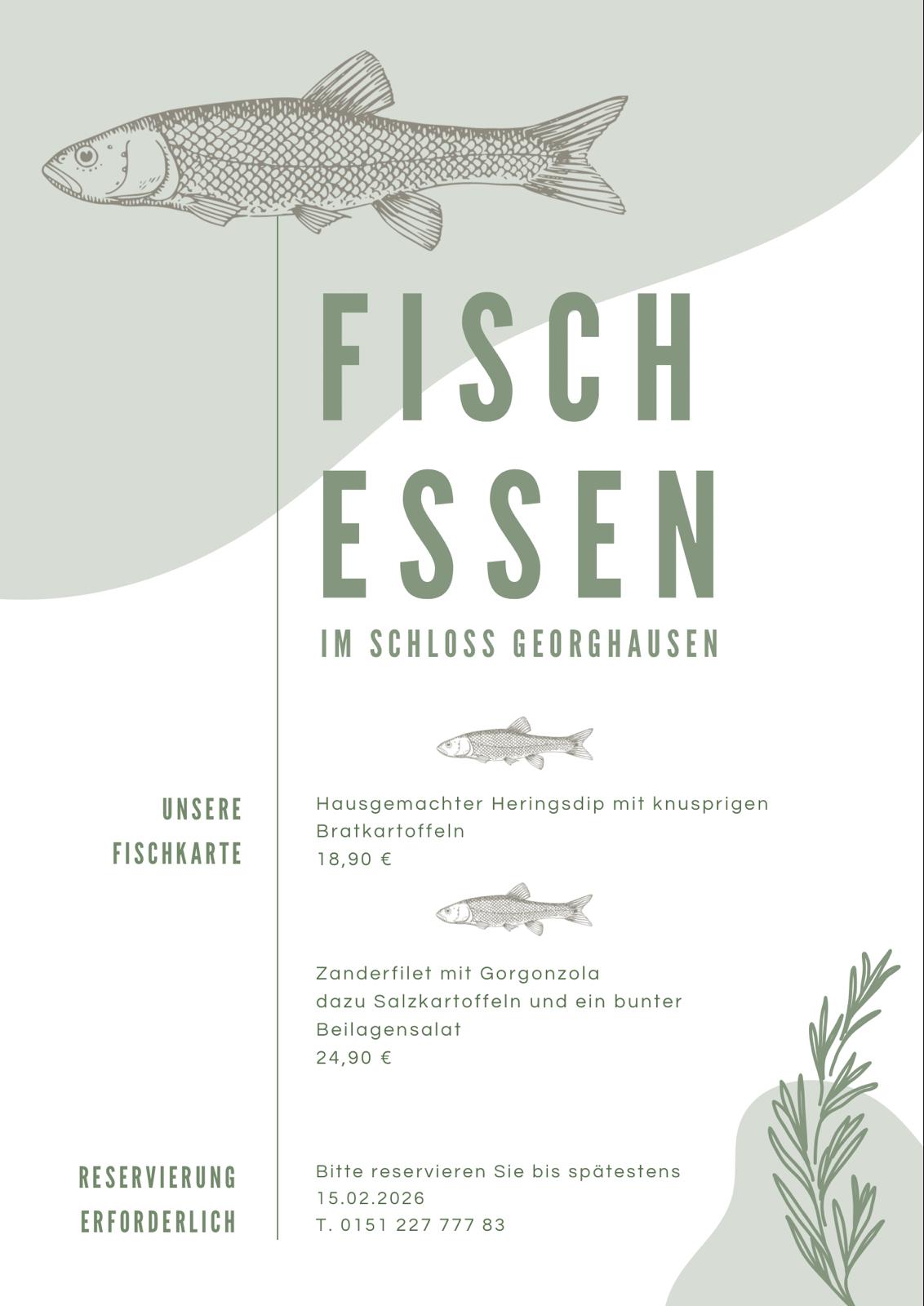 Die erste Gelegenheit, die Kochkünste unseres neuen Küchenchefs auszuprobieren, ergibt sich am Aschermittwoch. Dann startet Bina’s Schloss Restaurant mit einem traditionellen Fischessen aus der Winterpause. Es gibt hausgemachten Heringsdip mit knusprigen Bratkartoffeln oder Zanderfilet mit Gorgonzola, dazu Salzkartoffeln und einen bunten Beilagensalat.